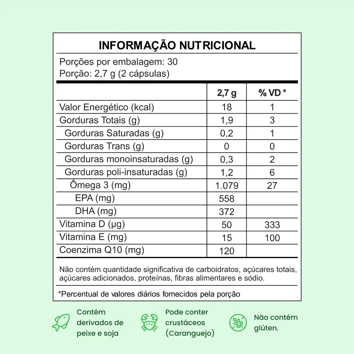 Combina EPA, DHA, Coenzima Q10, Vitamina D + E para suporte nutricional completo, com fórmula de alta qualidade e pureza garantida.